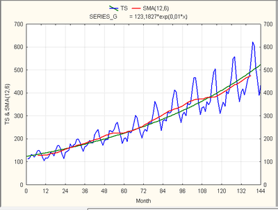 Рисунок 1.18 - Графики исходного ряда, экспоненциальной модели тренда