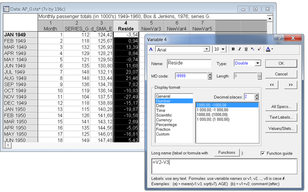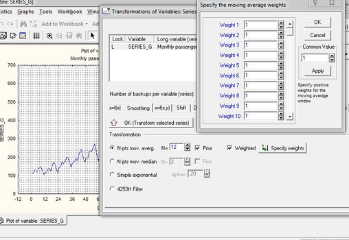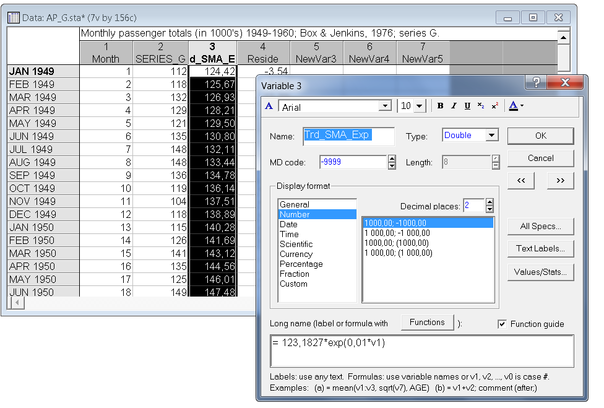 Мы можем добавить столбцы в нашу электронную таблицу. Для этого на панели быстрого доступа зайдем в меню Vars -> Add. Добавим 3 столбца. Первый столбец назовем Months. Для его заполнения, аналогично заполнению таблицы Excel, запишем в 2-х первых строках числа 1 и 2, выделим их и протащим до 156 строки (это больше количества отсчетов исходного ВР). Столбец заполнился числами от 1 до 156. Второй столбец заполним отсчетами SMA. Для этого дважды щелкаем по названию столбца. Редактируем название и в поле в нижней части рабочего окна записываем выражение для экспоненциальной оценки тренда.