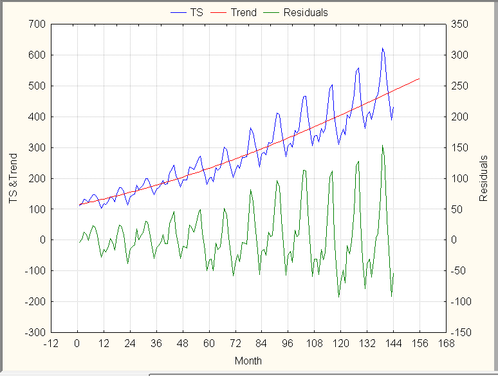 В результате получили модель тренда и остаточный НВР как разность между исходным рядом и трендом.