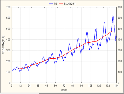 Для наглядности нужно поместить ВР и SMA на один график. На рисунке видно, что центрированная модель тренда обладает некоторыми недостатками, а именно, модель не охватывает левый и правый (что более важно) сегменты данных.