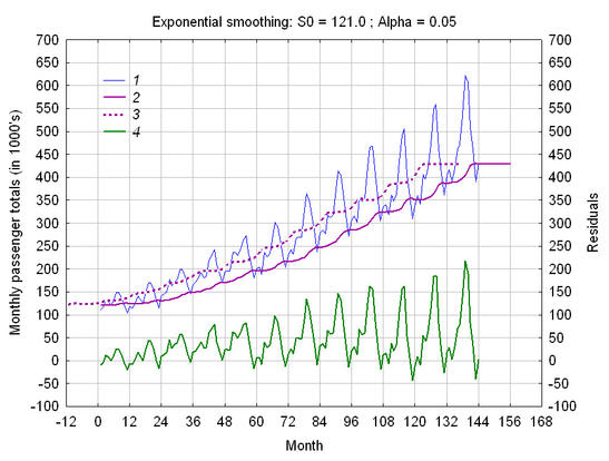 скользящей средней: 1 - НВР; 2- EMA(0,05; 0); 3 - EMA(0,05; 19); 4 - остаток