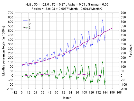 линейной модели Хольта: 1 – НВР; 2 – модель Хольта; 3 - остаток