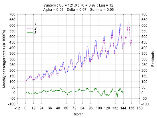 сезонности: 1- НВР; 2- модель Уинтерса; 3 - остаток