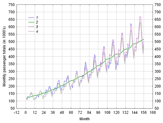 Наряду с рассмотренными выше локально линейными моделями трендов на практике широко применяют локально квадратичные, экспоненциальные и гиперболические модели в сочетании с квазипериодическими компонентами аддитивного и мультипликативного вида [15, с.59]. Однако, из анализ и практическое освоение выходи за рамки данных практических занятий.