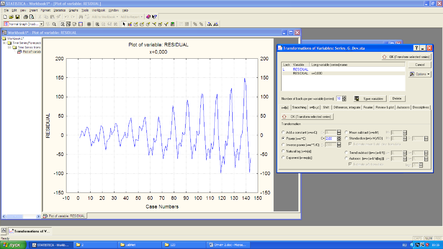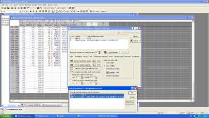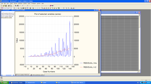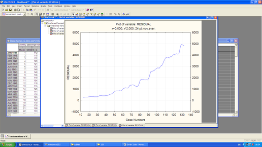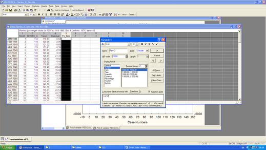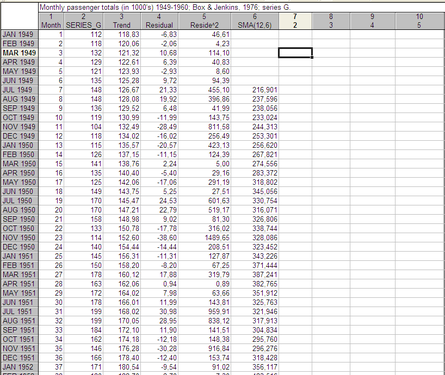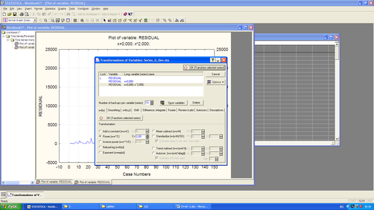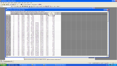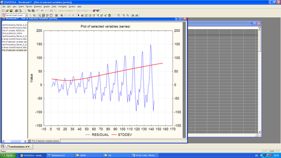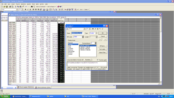 Сохраним результаты исследования в таблице, нажав кнопочку save variable. Копируем значения из появившейся вспомогательной таблицы из третьего столбца (в котором пустые первые 6 и последние 6 ячеек) и вставляем в нашу главную с соответствующей позиции. Теперь у нас в шестом столбике непараметрическая оценка дисперсии, основанная на простой скользящей средней, центрированная, поэтому сдвинутая назад на 6 шагов времени т.е. на половину интервала сглаживания: