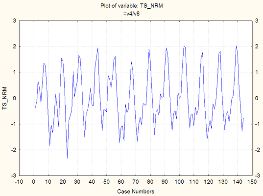 Для построения линий поддержи и сопротивления сначала формируем центрированный и нормированный временной ряд. В девятом столбике вбиваем формулу: остаток (4 столбец) делим на оценку СКО (8 столбик) т.е. всё приводим к стандартному единичному масштабу.