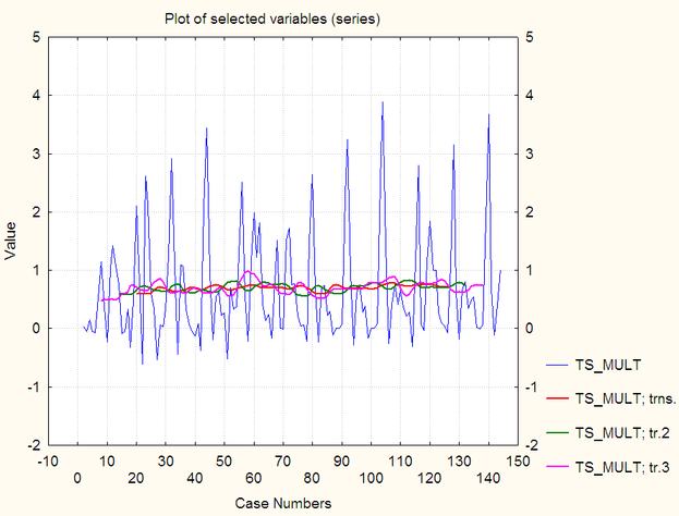 Теперь её надо сгладить. Проанализируем наличие аномальных зачений ВР на лаге 1. Для этого сформируем 5 оценок цетра группировки (мат.ожидания) этого ряда:
