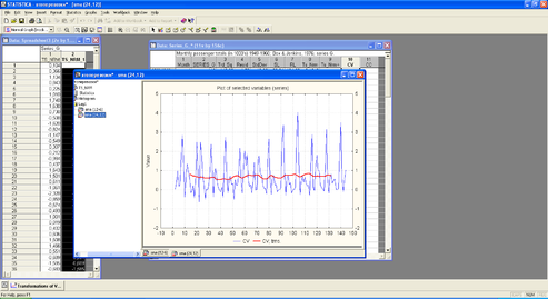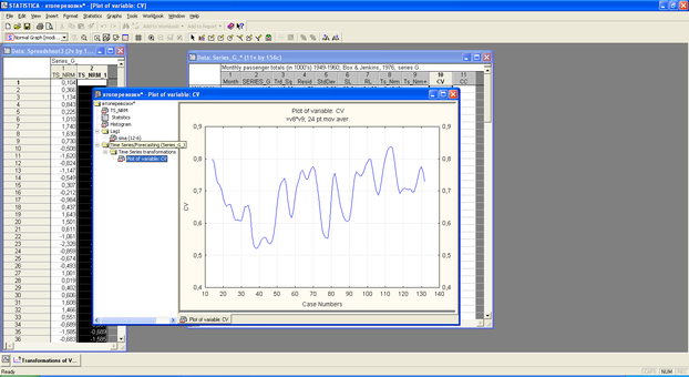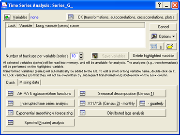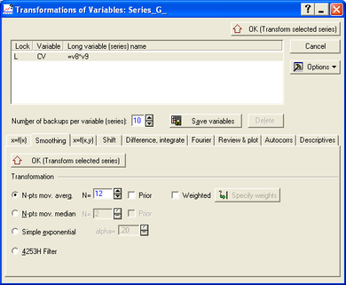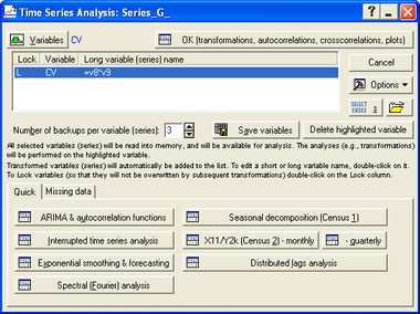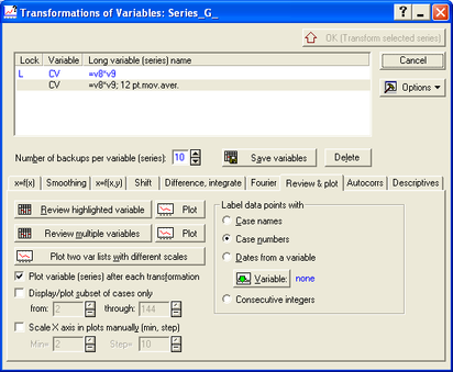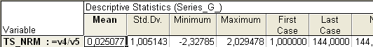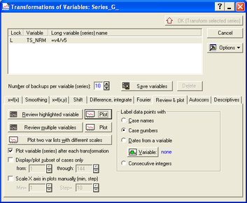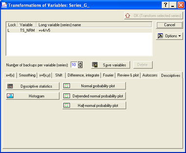 Заходим на закладку «Descriptives» окна «Transformations of Variables» (Statistics → Advanced Linear → Time Series/Forecasting → OK):