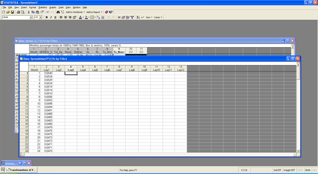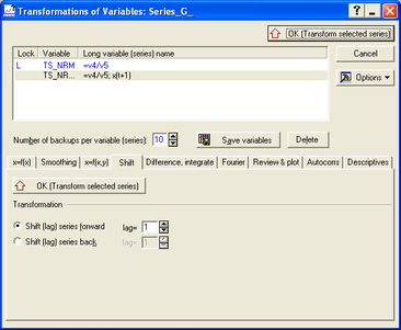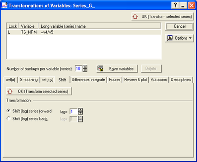 Сместим на один лаг вправо, для этого на закладке Shift (сдвиг) ставим значение параметра «Shift (lag) series forward» равное 1 и нажимаем на кнопку «OK (Transform selected series)» на этой закладке.
