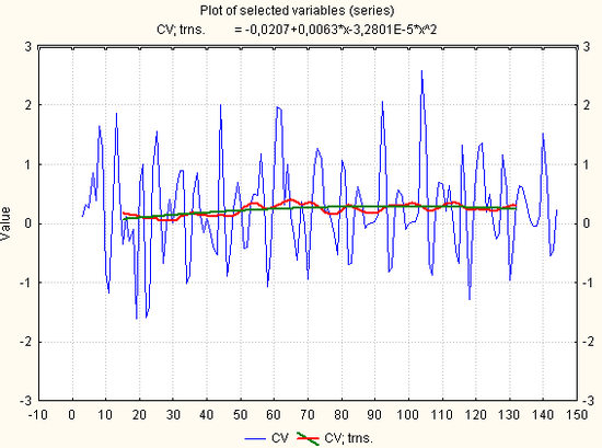 Синий график – обычный ряд; красный – сглаженный; зеленый – коэффициент корреляции на лаге 1.