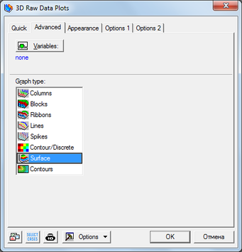 Заходим в пункт основного меню «Graphs» → «3D Sequential Graphs» → «Raw Data Plots». Затем в появившемся окне «Advanced» → «Surface» и нажать кнопку «ОК»
