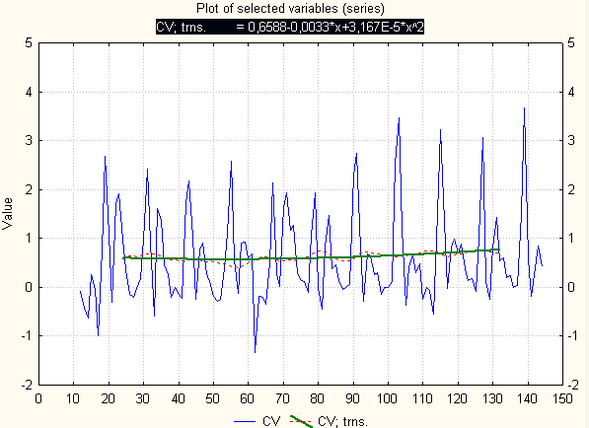 Рис. 42. График корреляционного произведения (синий), результата его сглаживания (красный) и коэффициента корреляции (зеленый) на лаге 12