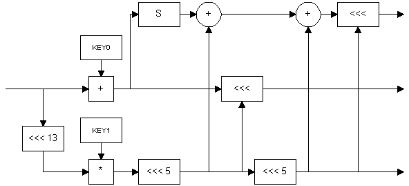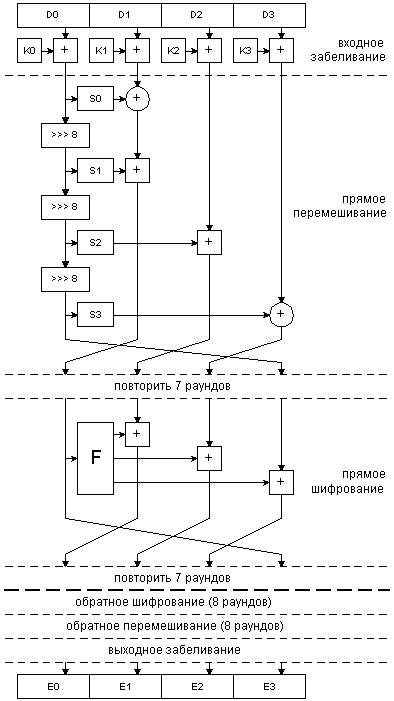 Шифр состоит из трех видов операций, которые повторяются сначала в прямом, а затем в инверсном порядке. На первом шаге идет классическое входное забеливание : ко всем байтам исходного текста добавляются байты из материала ключа.