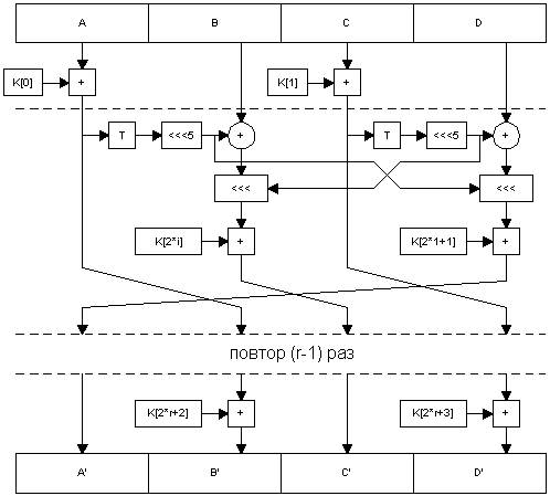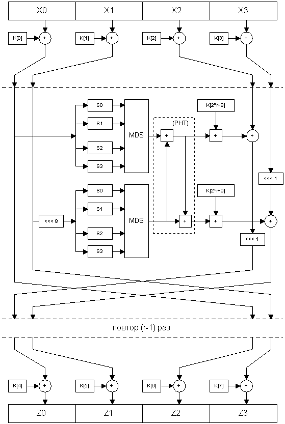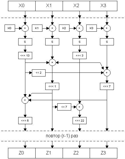 Алгоритм является сетью Фейштеля с 4 ветвями смешанного типа : в нем два четных блока используются для одновременного изменения содержимого двух нечетных блоков. Затем производится обычный для сети Фейштеля сдвиг на одно машинное слово, что меняет четные и нечетные блоки местами. Сам алгоритм предельно прост и изображен на рисунке 1. Разработчики рекомендуют при шифровании использовать 20 раундов сети, хотя в принципе их количество не регламентируется. При 20 повторах операции шифрования алгоритм имеет самую высокую скорость среди 5 финалистов AES.