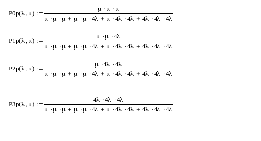 После применения обратного преобразования Лапласа и подстановки значений: =0.025 =1 можно получить выражения для P0(t), P1(t), P2(t), P3(t) и P(4)