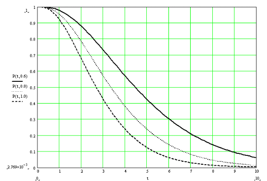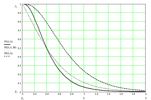 Зависимость вероятности безотказной работы P(t) от времени работы системы t для различных значений интенсивности отказа элементов λ представлена на графиках: