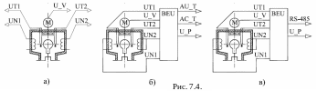В варианте по рис. 7.4, б) блок энергоавтоматики и управления BEU включен в состав элемента. Энергетический интерфейс стал стандартным - простое сетевое напряжение питания U_P требуемой мощности. Информационный интерфейс – сигнал аналогового управления AU_T, сообщающий блоку BEU требуемую температуру. Локальная САУ, входящая в состав блока энергоавтоматики и управления, должна выполнять то, что раньше делала централизованная САУ: считывать сигнал о фактической температуре с термопар, сравнивать его с требуемой температурой AU_T, по рассогласованию рассчитывать управляющее воздействие и выдавать его семисторный регулятор мощности блока BEU.