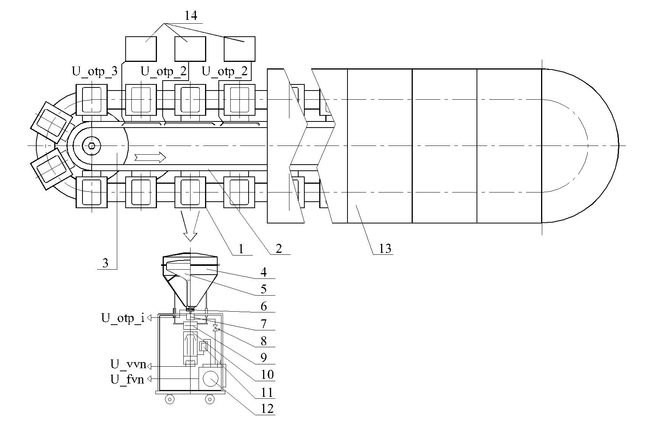 Термообработка оболочки проводится в секциях туннельной печи 13. Температура по секциям сначала возрастает, затем поддерживается постоянной и охлаждается в соответствии с заданным графиком. Инструмент для обезгаживания распределен по ряду стационарных позиций, а заготовка перемещается относительно них - это типовое последовательное агрегатирование.