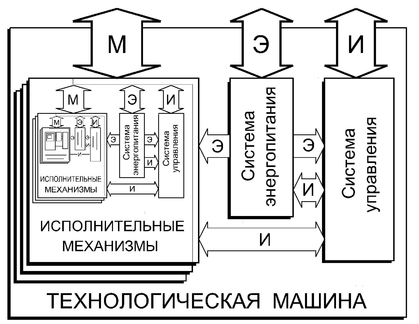 В развитом исполнительном механизме также можно выделить свою подсистему энергообеспечения и управления. Такое деление целесообразно ввести еще и потому, что в разработке современной технологической машины принимают участие три группы специалистов: инженеры механики, разрабатывающие машину в целом и ее целевые механизмы, инженеры электрики и электронщики, разрабатывающие систему энергообеспечения и аппаратную часть системы управления и инженеры программисты, разрабатывающие программное обеспечение. Структура должна определять технические задания для каждого из коллективов разработчиков.