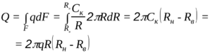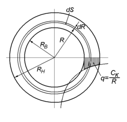 Для приработанных дисков линейный абразивный износ трущихся поверхностей не зависит от текущего радиуса и пропорционален произведению qR=Cк=const, тогда q= Cк/R. Сила сжатия дисков Q с учетом переменности величины
