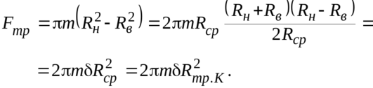 т.е. расчетный радиус трения Rтр.М для муфт с кольцевыми накладками равен среднему радиусу Rср поверхности трения кольцевой накладки, Rтр.М=Rср [3].