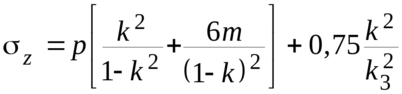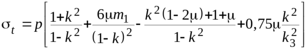 Напряженное состояние в стенках цилиндра вблизи днища во многом зависит от формы днища. Наиболее опасным оно бывает у цилиндров с плоским дном. В этом случае, как и у фланца, в стенке цилиндра у днища действуют внутренние силовые факторы: силы Р, Q и момент М (см. рис. 2.5). Из-за большой жесткости днища в радиальном направлении возникают дополнительные напряжения, особенно большие на внутренней поверхности цилиндра от изгиба стенок и прогиба днища. Наибольшего значения эти растягивающие напряжения достигают в галтели В перехода трубной части цилиндра в донную (см. рис. 2.6). Для цилиндра с плоским днищем, опирающегося на фланец, напряжения в галтели В равны [9]: