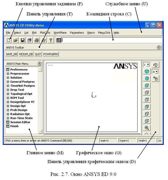 Графический интерфейс программы состоит из нескольких окон. При запуске программы на экране появляется окно ANSYS ED 9.0 (см. рис. 2.7), которое включает: