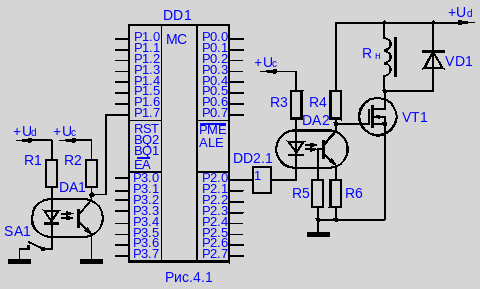 Читая состояние выводу порта Р1.7 можно определить, включен или выключен конечный выключатель SA1, т.е. проводить дискретный контроль объекта. Этот конечный выключатель может быть встроен, например, в вакуумный клапан и указывать нам, открыт он или закрыт.