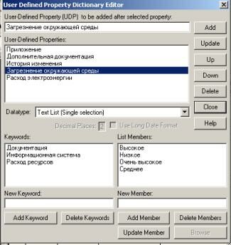 Для описания UDP служит диалог User-Defined Property Editor (меню Model/UDP Definition Editor) (рис. 41). В верхнем окне диалога вносится имя UDP, в списке выбора Datatype описывается тип свойства. Имеется возможность задания 18 различных типов UDP, в том числе управляющих команд и массивов, объединенных по категориям. Для внесения категории следует задать имя категории в окне New Keyword и щелкнуть по кнопке Add Category. Для присвоения свойства категории необходимо выбрать UDP из списка, затем категорию из списка категорий и щелкнуть по кнопке Update. Одна категория может объединять несколько свойств, в то же время одно свойство может входить в несколько категорий. Свойство типа List может содержать массив предварительно определенных значений. Для определения области значений UDP типа List следует задать значение свойства в окне New Keyword и щелкнуть по кнопке Add Member. Значения из списка можно редактировать и удалять.