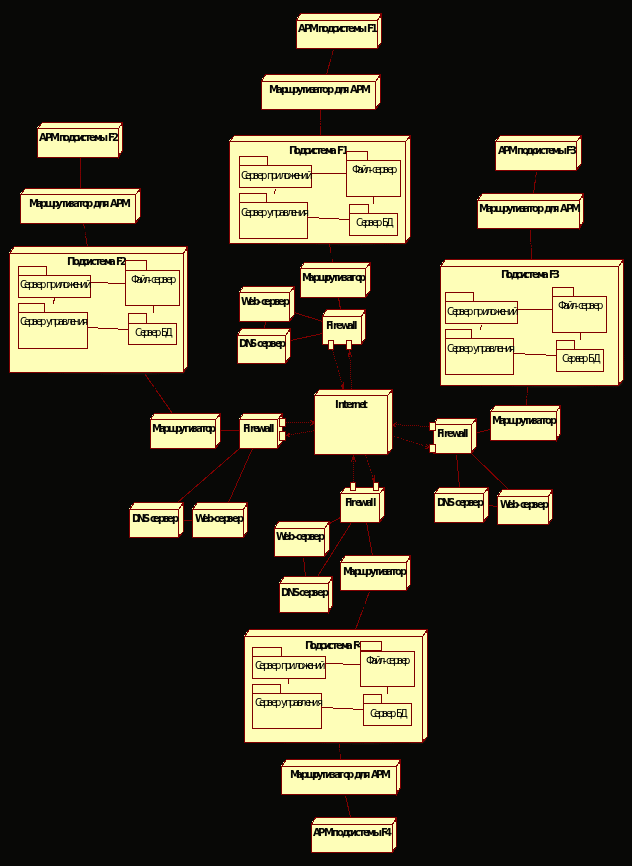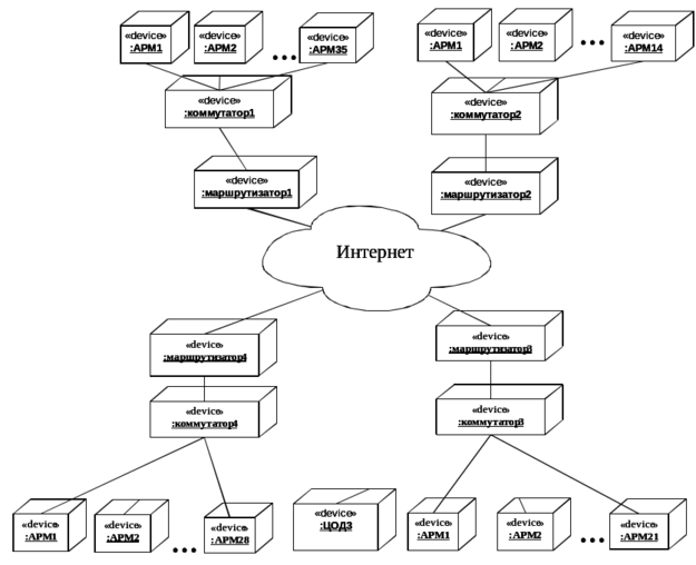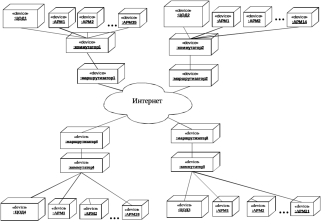 Построить UML –диаграмму развертывания для распределенной технологической архитектуры «Как есть», отразив в ней все компоненты ИТ-инфраструктуры для каждой территории, связи между ними, трафик через каналы связи между отдельными территориями, а также размещение компонент архитектуры информации и прикладной архитектуры на серверах ЦОДов отдельных территорий.