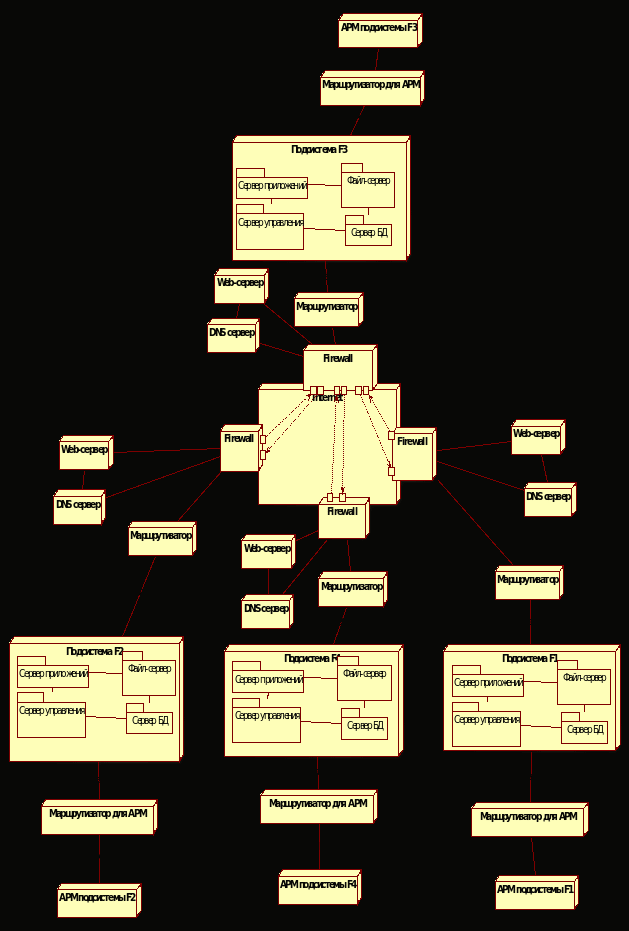Построить UML –диаграмму развертывания для централизованной технологической архитектуры «Как должно быть», отобразив в ней все компоненты ИТ-инфраструктуры для каждой территории, связи между ними, трафик через каналы связи между отдельными территориями, а также размещение компонент архитектуры информации и прикладной архитектуры на серверах ЦОДов отдельных территорий