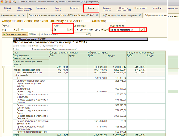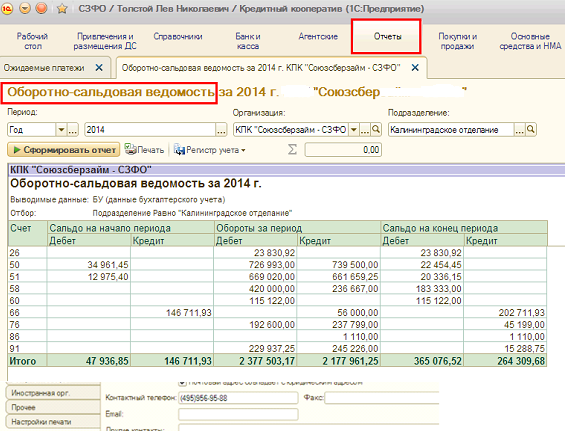 Найти в разделе «Отчёты» оборотно-сальдовые ведомости отделений компании