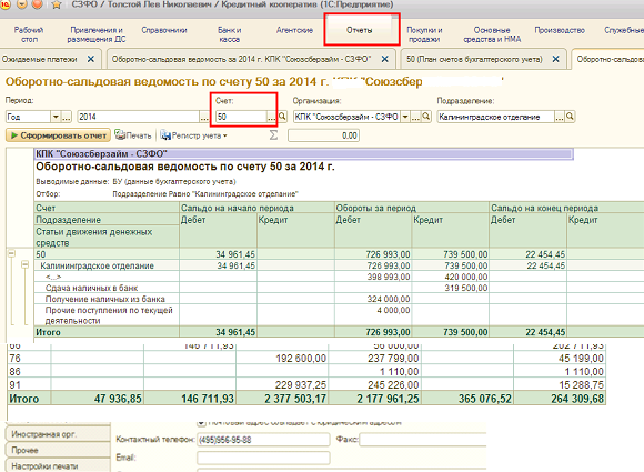 Просмотреть итоговые финансовые показатели (анкеты счетов) для касс отделений компании (постоянный код кассы в списке счетов оборотно-сальдовой ведомости – 50)