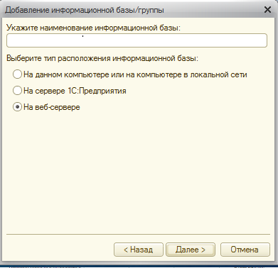 После первого запуска программы 1С-тонкий клиент появится сообщение о том, что список информационных баз пуст.