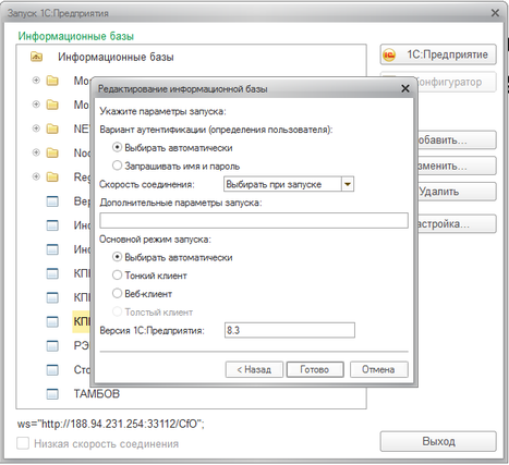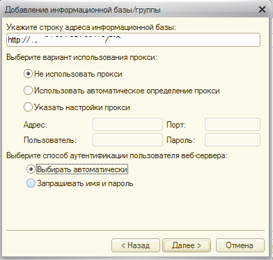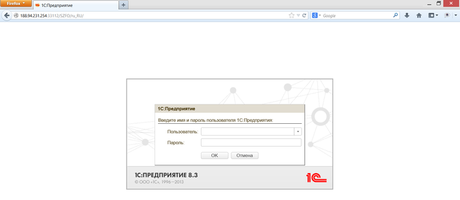 Ввести в адресную строку адрес WEB-сервера (URL), через который осуществляется доступ к базе данных (БД), к которой требуется подключиться, например, http://IP_address:Port/Organization_XXX (Цепочка подключения следующая: клиент- интернет- вэб-сервер – сервер_приложений_ сервер_БД).