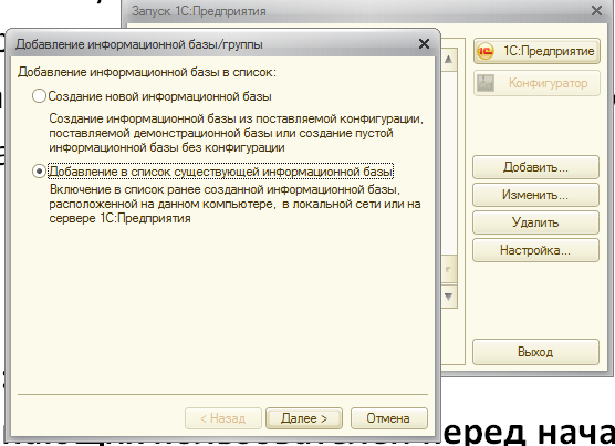 Создаем новую запись для доступа к уже существующей БД. Для этого в стартовом окне жмем кнопку «Добавить», затем выбираете пункт «Добавление в список существующей информационной базы», жмем «Далее», как показано на этом рисунке