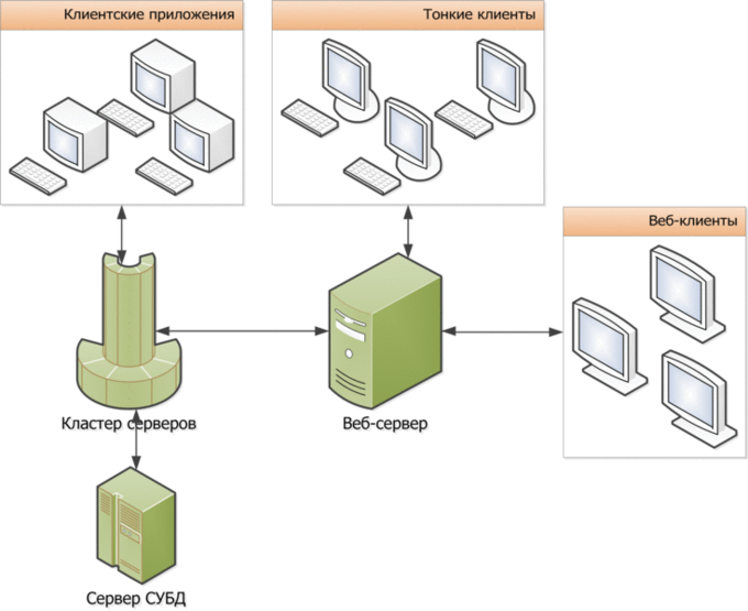 Архитектура системы ориентирована на максимальный перенос выполнения всей функциональности на кластер серверов и максимальное «облегчение» клиента. В кластере серверов выполняется вся работа прикладных объектов, выполняется подготовка к отображению форм (чтение объектов из информационной базы и заполнение данных формы, расположение элементов, запись данных формы после изменения) и командного интерфейса, формируются отчеты. На клиенте выполняется только отображение информации, подготовленной в кластере серверов, выполняется взаимодействие с пользователем и вызовы серверных методов для выполнения необходимых действий.