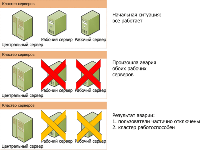 Аварийно завершают работу два рабочих сервера, при этом центральный сервер сохраняет работоспособность. При этом превышен уровень отказоустойчивости, как следствие, будут завершены сеансы пользователей, которые обслуживались завершившимися рабочими серверами. Пользователи, которых обслуживает центральный сервер – сохранят работоспособность. При этом будет возможно подключение новых пользователей.