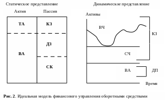 Идеальная модель финансового управления оборотными средствами (рис. 2) состоит в том, что долгосрочные пассивы устанавливаются на уровне внеоборотных активов, то есть базовое балансовое уравнение (модель) имеет вид:
