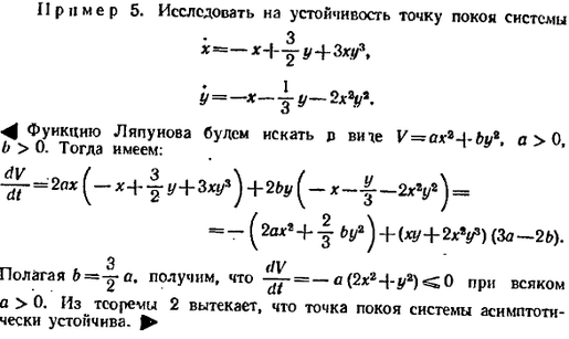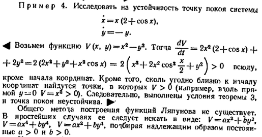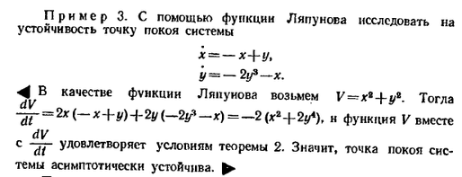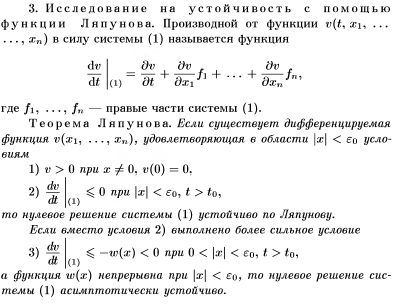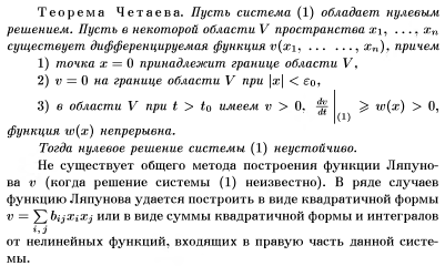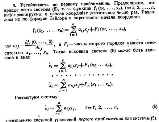 Справедливо следующее утверждение: если все корни характеристического уравнения системы (6) имеют отрицательные действительные части, то точка покоя системы (6), а также исходной' системы (5) асимптотически устойчива; если хотя бы о тип из корней характеристического уравнения системы (6) имеет положительную действительную часть, то точка покоя системы (6) (и системы (5)) неустойчива.