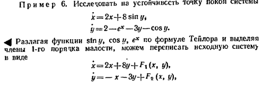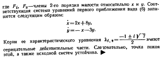 Говорят, что в этих случаях возможно исследование системы (5) на устойчивость по первому приближению. В остальных случаях такое исследование, вообще говоря, невозможно, так как начинает сказываться влияние членов 2-го порядка малости.