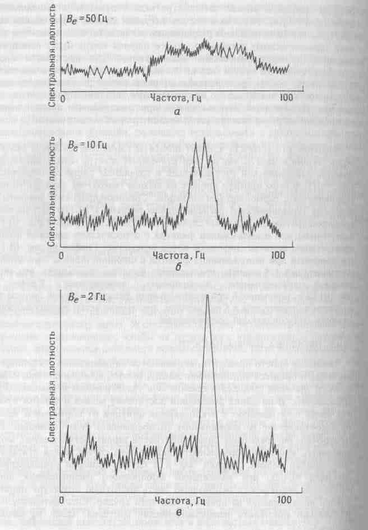 Если максимум отвечает гармоническому колебанию, то его ширина всегда будет совпадать с шириной полосы пропускания используемого для построения оценки фильтра, сколь бы малой она ни была, и высота максимума всегда будет расти пропорционально уменьшению полосы пропускания (рис.2).