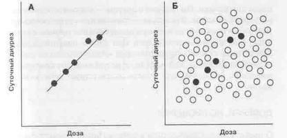 Рассмотрим типичный пример применения статистических методов в медицине. Создатели препарата предполагают, что он увеличивает диурез пропорционально принятой дозе. Для проверки этого предположения они назначают пяти добровольцам разные дозы препарата. По результатам наблюдений строят график зависимости диуреза от дозы (рис. 1А). Зависимость видна невооруженным глазом. Исследователи поздравляют друг друга с открытием, а мир — с новым диуретиком.