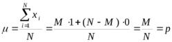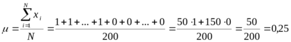Повторим это рассуждение для общего случая. Пусть имеется совокупность из N членов. При этом М членов обладают каким-то качественным признаком, которого нет у остальных N-M членов. Введем числовой признак х: у членов совокупности, обладающих качественным признаком, он будет равен 1, а у членов, не обладающих этим признаком, он будет равен 0. Тогда среднее значение х равно