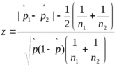 При применении описанного выше критерия оценка Р оказывается заниженной и нулевая гипотеза будет отвергаться слишком часто. Причина состоит в том, что z принимает только дискретные значения, тогда как приближающее его нормальное распределение непрерывно. Для компенсации излишнего «оптимизма» критерия z введена поправка Йейтса, называемая также поправкой на непрерывность. С учетом этой поправки выражение для z имеет следующий вид: