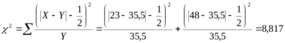 Реакция только на динитрохлорбензой наблюдалась у 23 больных, а только на кротоновое масло — у 48. Если действие динитрохлорбензола и кретонового масла примерно одинаково, то больные, у которых наблюдалась реакция только на один раздражитель, разделились бы примерно поровну — у одной половины реакцию вызвал бы динитрохлорбензол, у другой — кротоновое масло. Следовательно, ожидаемое число в обоих случаях (23 + 48)/2 = 35,5. Для сравнения наблюдаемых чисел с ожидаемыми воспользуемся критерием 2. (Поскольку число степеней свободы равно 1, применим также поправку Йейтса.) Имеем: