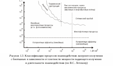 ринято классифицировать воздействие лазерного излучения на биоткань по трем параметрам: длине волны, плотности энергии (мощности) и длительности воздействия. Это позволяет изображать его графически, например, в виде диаграммы (рисунок 1.3).