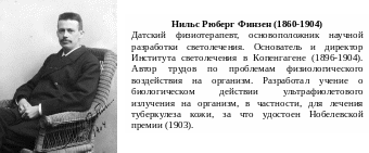 1896г. датский ученый Нильс Рюберг Финзен (Niels Ryberg Finsen) создал в Копенгагене Институт световой терапии. В 1903 г за работы по изучению действия ультрафиолетового излучения на организм человека Финзен был удостоен Нобелевской премии по медицине. Он показал, что ультрафиолетовое излучение обладает лечебным эффектом, в частности при туберкулезе кожи и нагноении при оспе, а также предложил оригинальную конструкцию лампы, позволявшую использовать в медицинских целях электрическую дугу (лампа Финзена). В дальнейшем ультрафиолетовое излучение получило широкое распространение в медицине и для целей стерилизации.
