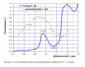 На рисунке 1.2. отчетливо виден локальный максимум поглощения в воде и крови в районе 0,97 мкм. Глубина поглощения в биотканях в этой области составляет величину порядка 1 мм, благодаря чему такое излучение обеспечивает хорошее сочетание режущих и коагулирующих свойств.