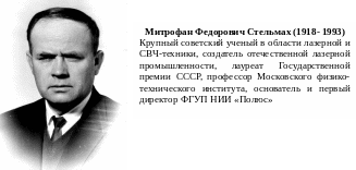о времени разработку и производство медицинской лазерной техники в нашей стране можно разбить на два периода. До начала 90-х годов эта аппаратура разрабатывалась на крупных промышленных предприятиях, в первую очередь, Научно-производственном объединении «Полюс». Здесь уместно упомянуть создателя и первого Генерального директора НПО «Полюс» профессора М.Ф. Стельмаха, внесшего значительный вклад в становлении лазерной отрасли промышленности в СССР, и, в частности, в организацию разработок и производства лазерной медицинской аппаратуры.